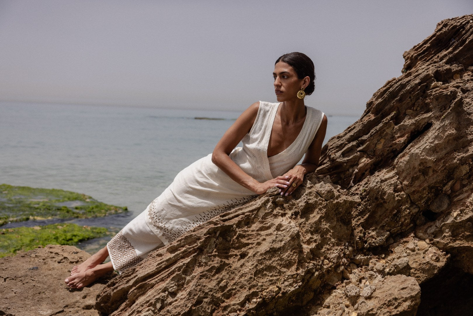 The Rusumi collection celebrates the art of traditional craftsmanship with modern sensibility. Each piece features intricate geometric patterns that tell stories of heritage and timeless beauty. This elegant kimono is crafted from 100% linen with beautiful brown pattern details.